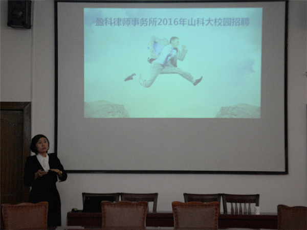 招聘会伊始,一部简短生动的盈科律师事务所的宣传片使在场同学对盈科有了一个大致的了解。随后东莞分所的负责人柴永霞从盈科现状、发展理念、全球体系等方面系统地向同学们阐述了盈科。紧接着,柴律师重点讲解了此次招聘的具体岗位及人才标准。在场同学结合自身情况提出疑惑,进行交流与互动。